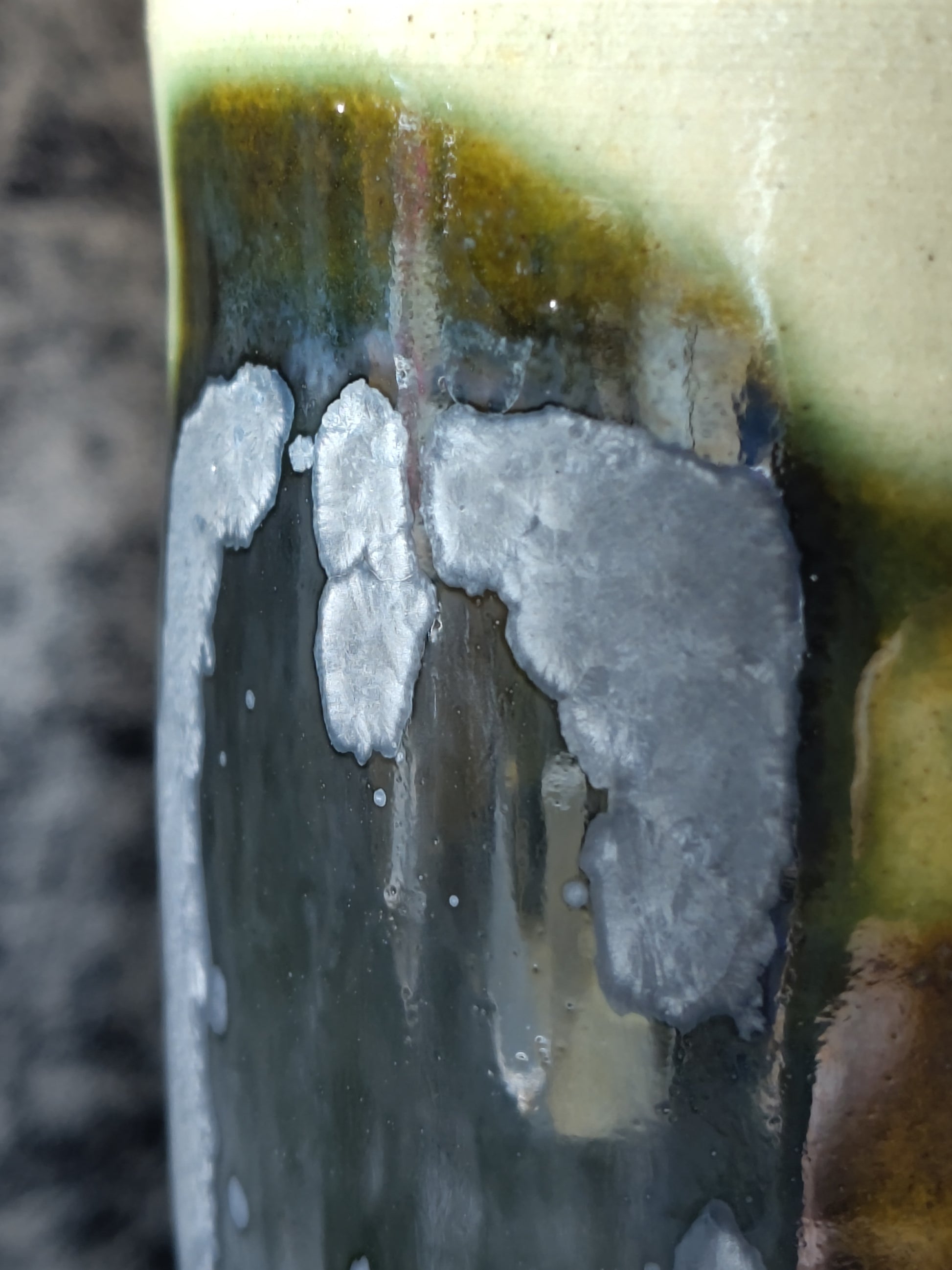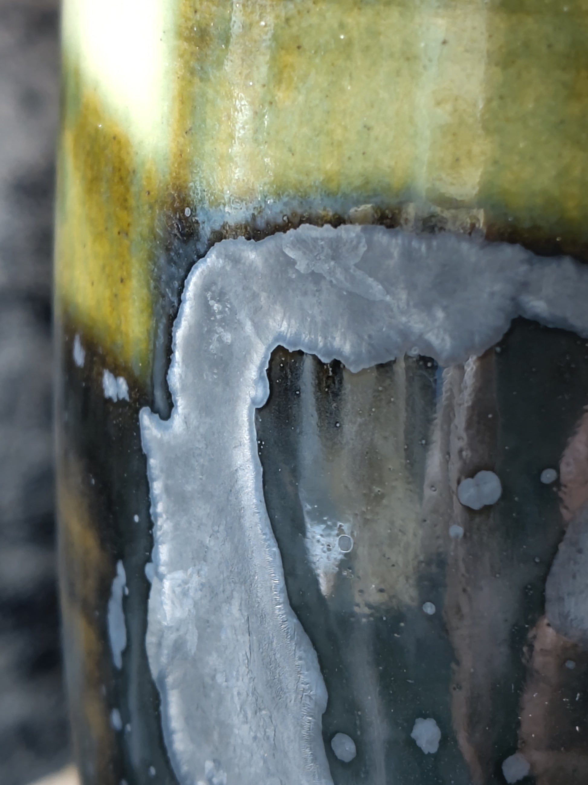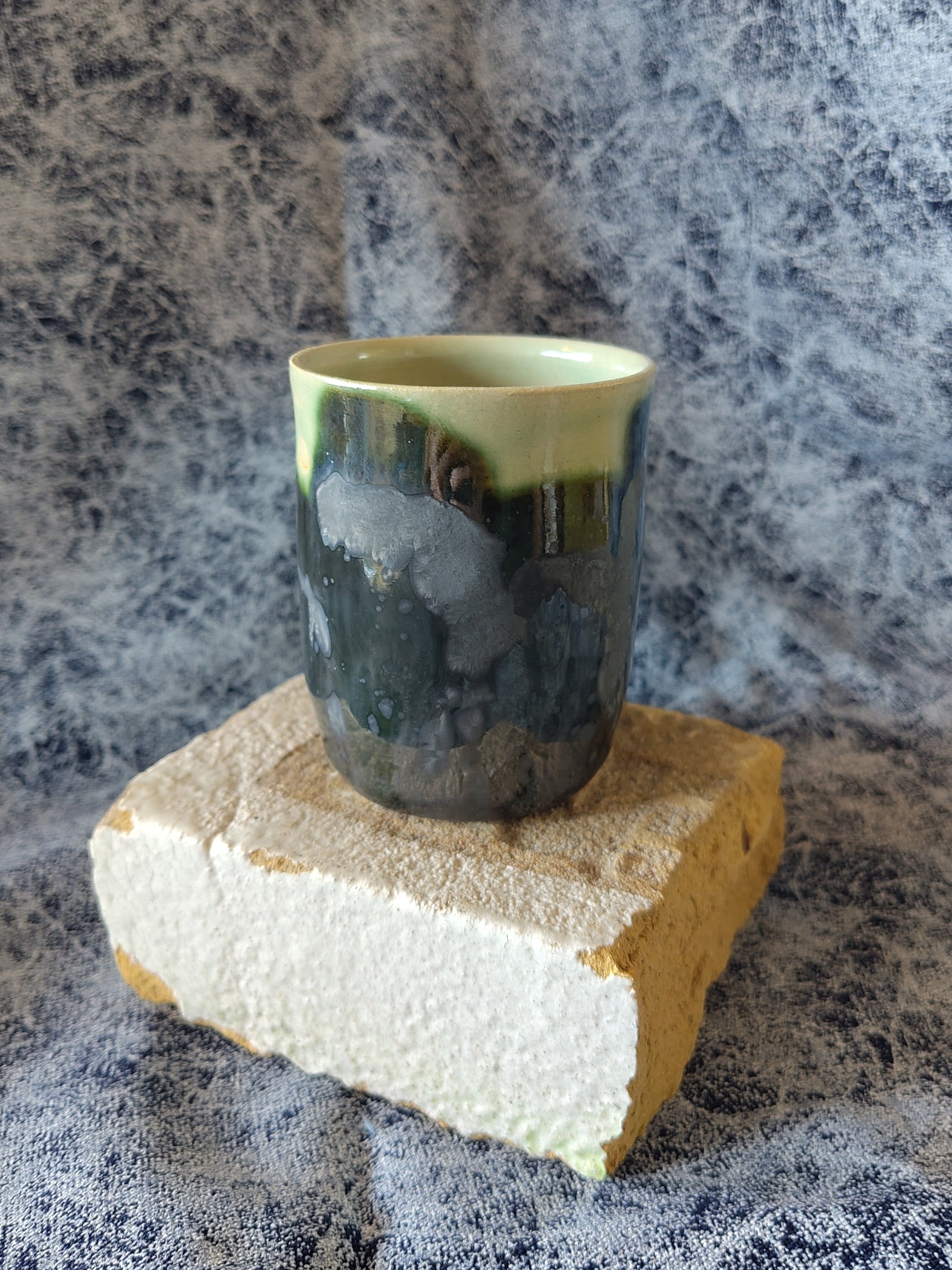 The pattern on this mug is brushed on in layers with a dark green copper oxide wash and covered in a crystalline glaze. Large crystalline structures have grown in the surface during the glaze firing.