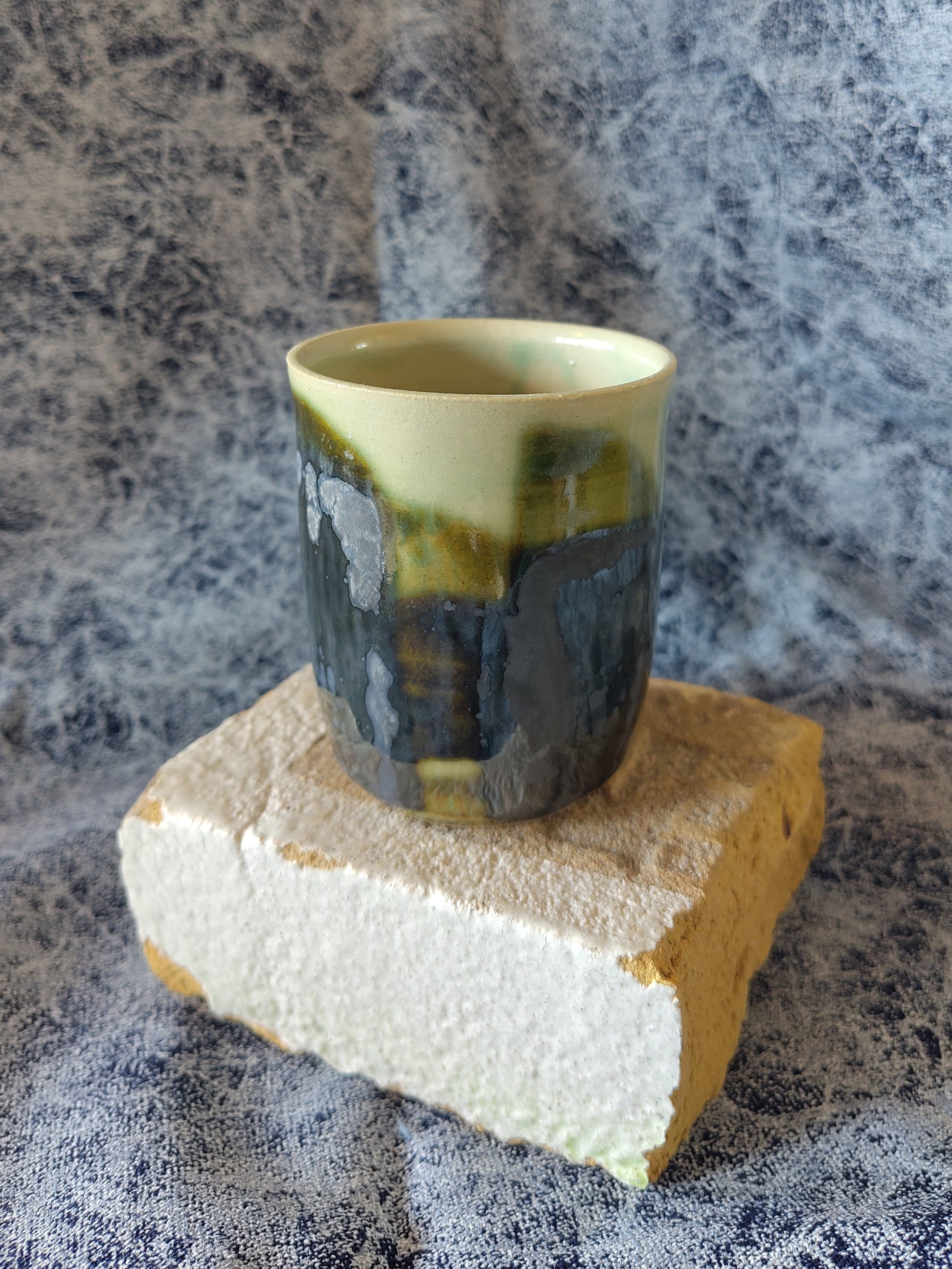 A small tumbler with a green seaweed stripes pattern covered in a sea blue glaze.